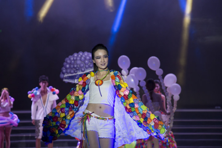 的传统强项,今年我们作品《欢乐颂》以气球为主要材料,纯系手工制作的服饰颜色鲜艳,造型夸张活泼。多彩的气球既是童真的表现,也是对梦想正在追逐的正面表达。第三个出场的男模特头顶斗篷,颜色为红橙黄的渐变,营造了火焰感觉;压场模特身披气球,气场宏大且具有观赏美感。最终,《欢乐颂》以9.31分的高分位列第二名,新闻院荣获亚军。