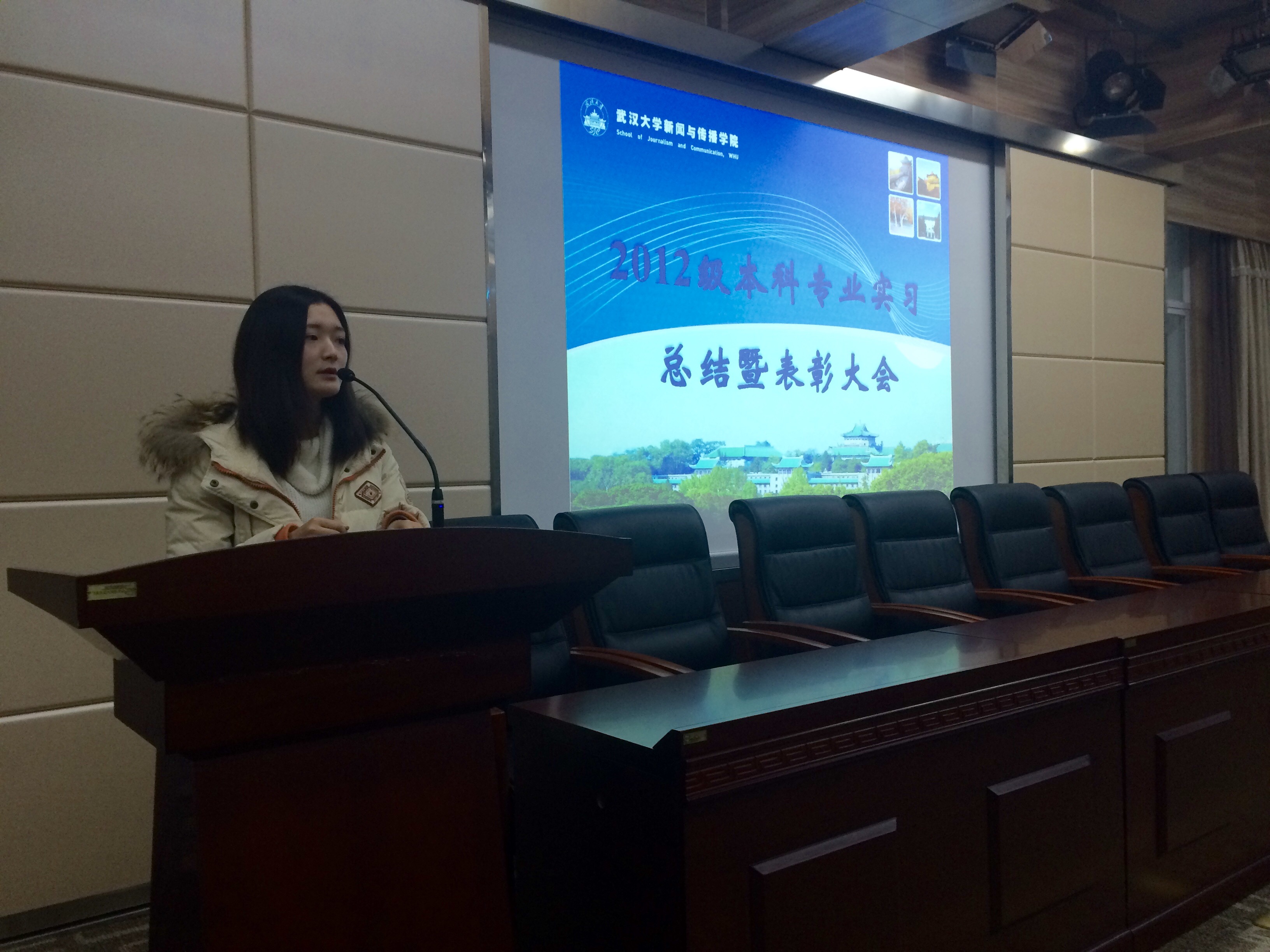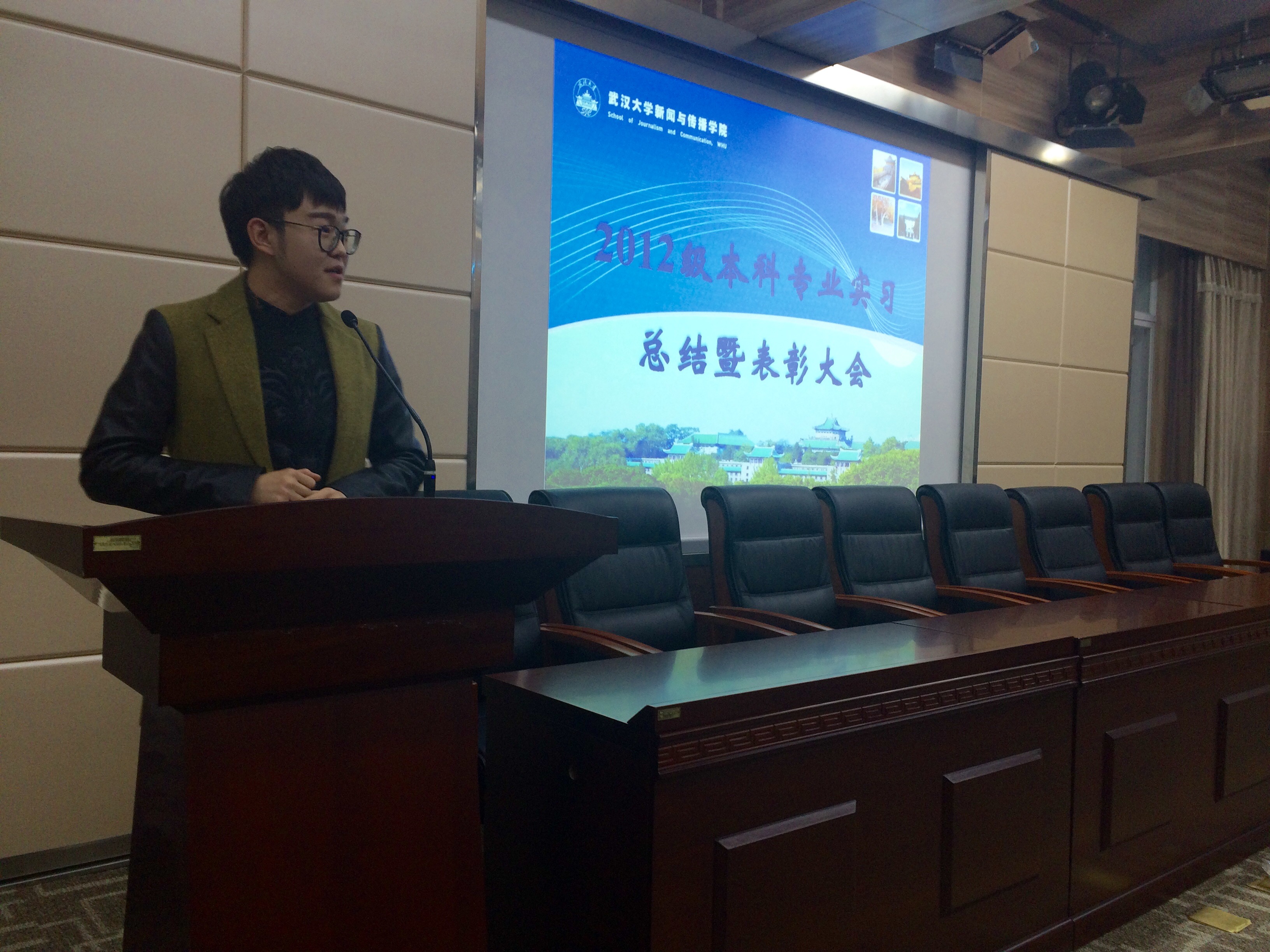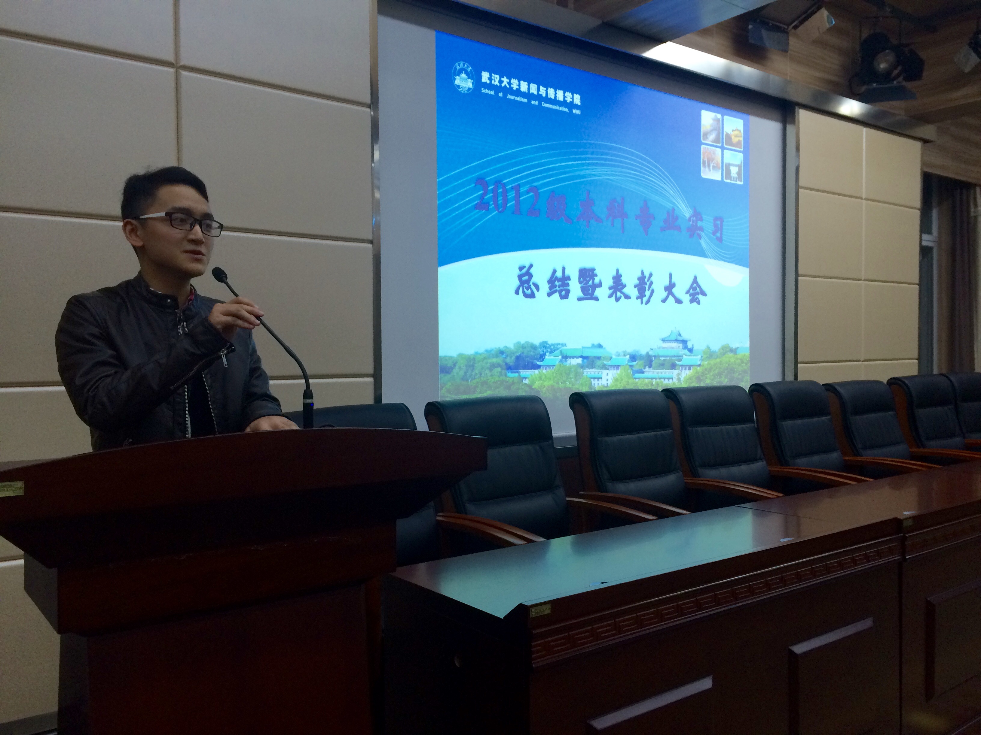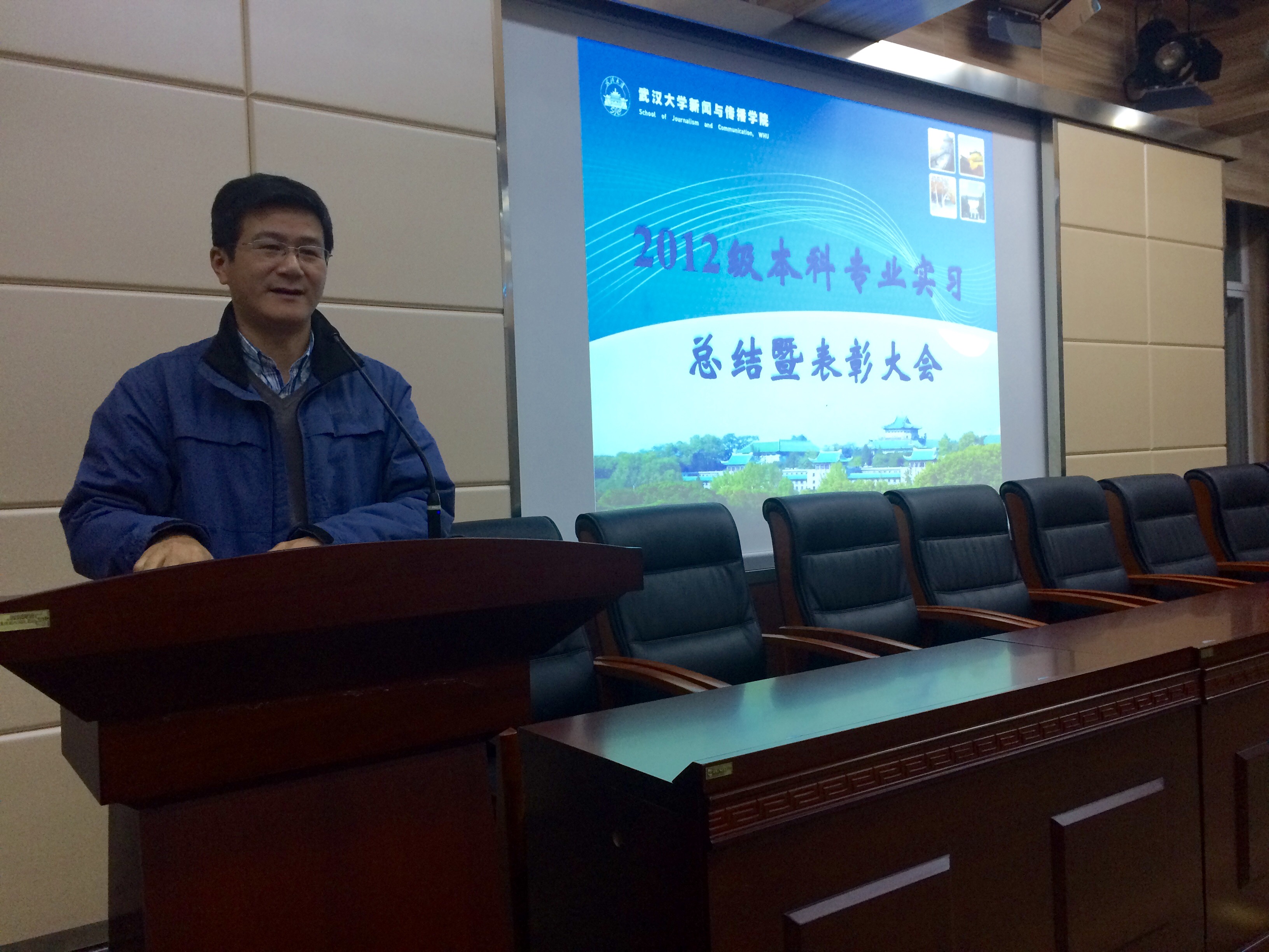 2012级本科生专业实习报告会暨表彰大会于院办报告厅举行。与会嘉宾有副院长强月新,院党委副书记楚静,实习小组组长周茂君,实习小组指导老师冉华、叶晓华、洪杰文,以及院本科生工作办公室老师。2013级全体学生参加了本次大会。