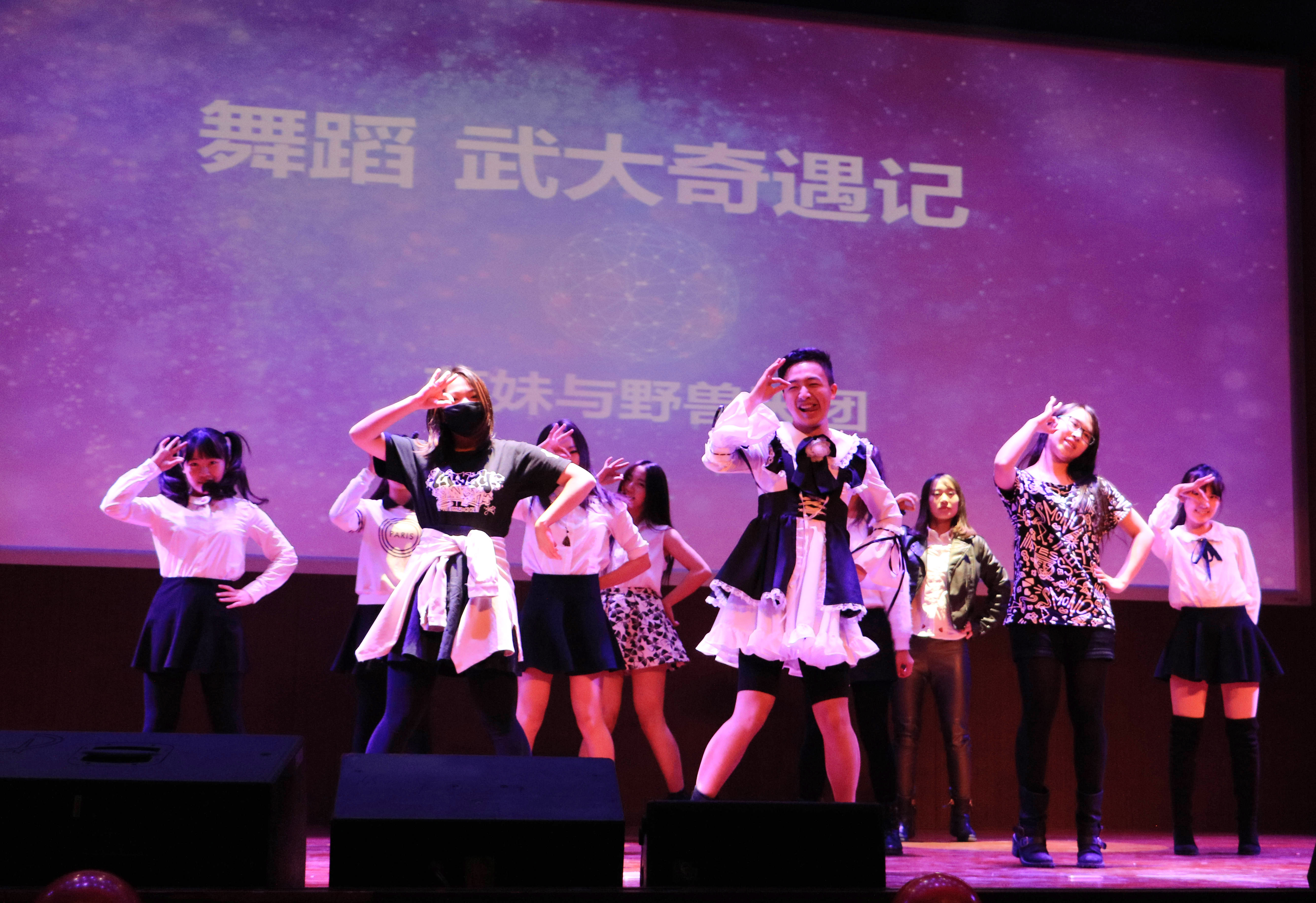 四位主持人幽默风趣的开场之后,是由“萌妹与野兽天团”带来的舞蹈《武大奇遇记》。风格迥异的奇葩舞蹈轮番登场,她们努力用热情感染每一个人。