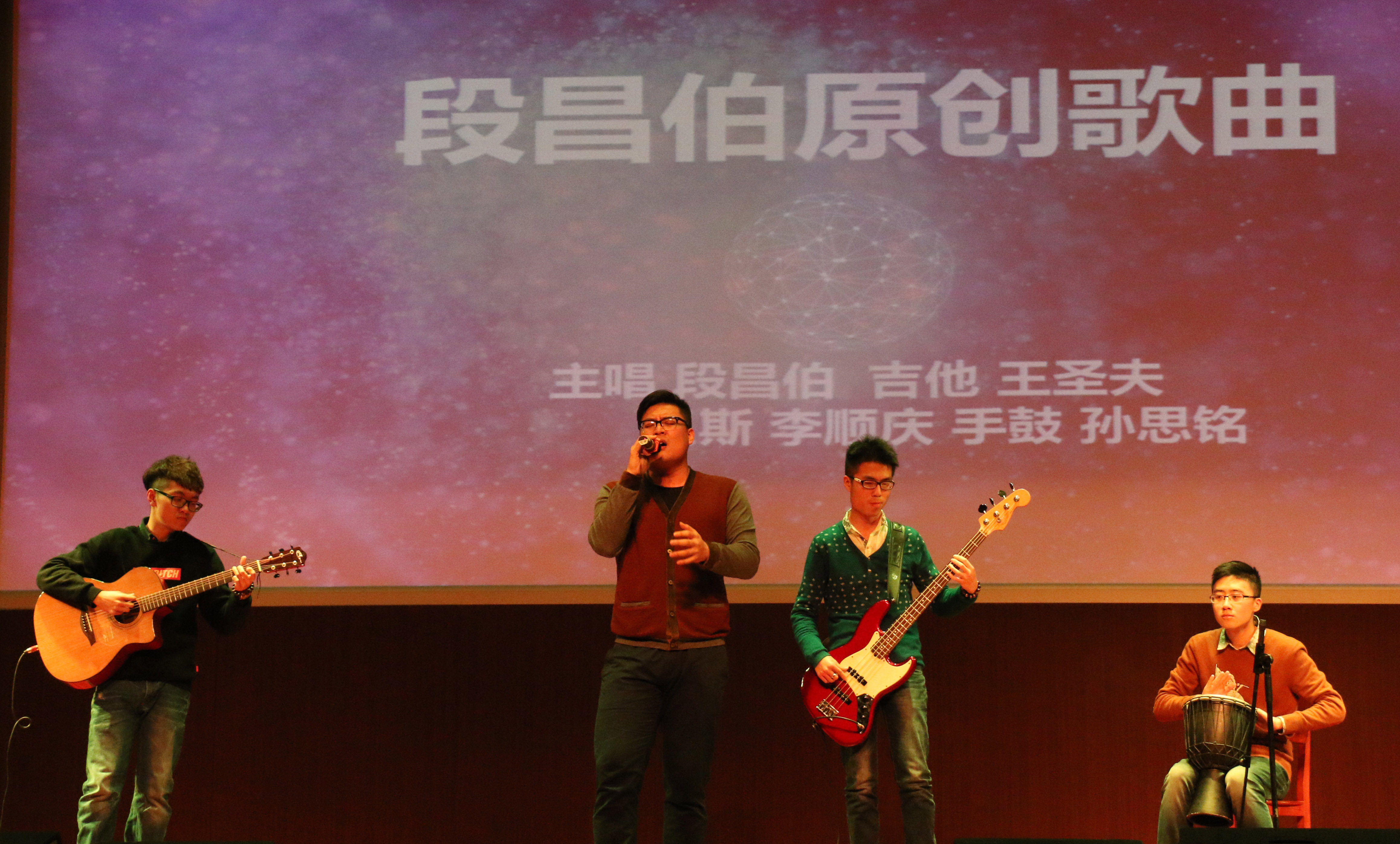 最后,段昌伯的原创歌曲作为压轴节目,让整场晚会达到了最后的高潮。大家随着音乐摇摆、跟唱,意犹未尽。在《合照》的旋律里,每个人都收获了身在武大新闻院的温暖和感动,元旦晚会圆满结束。