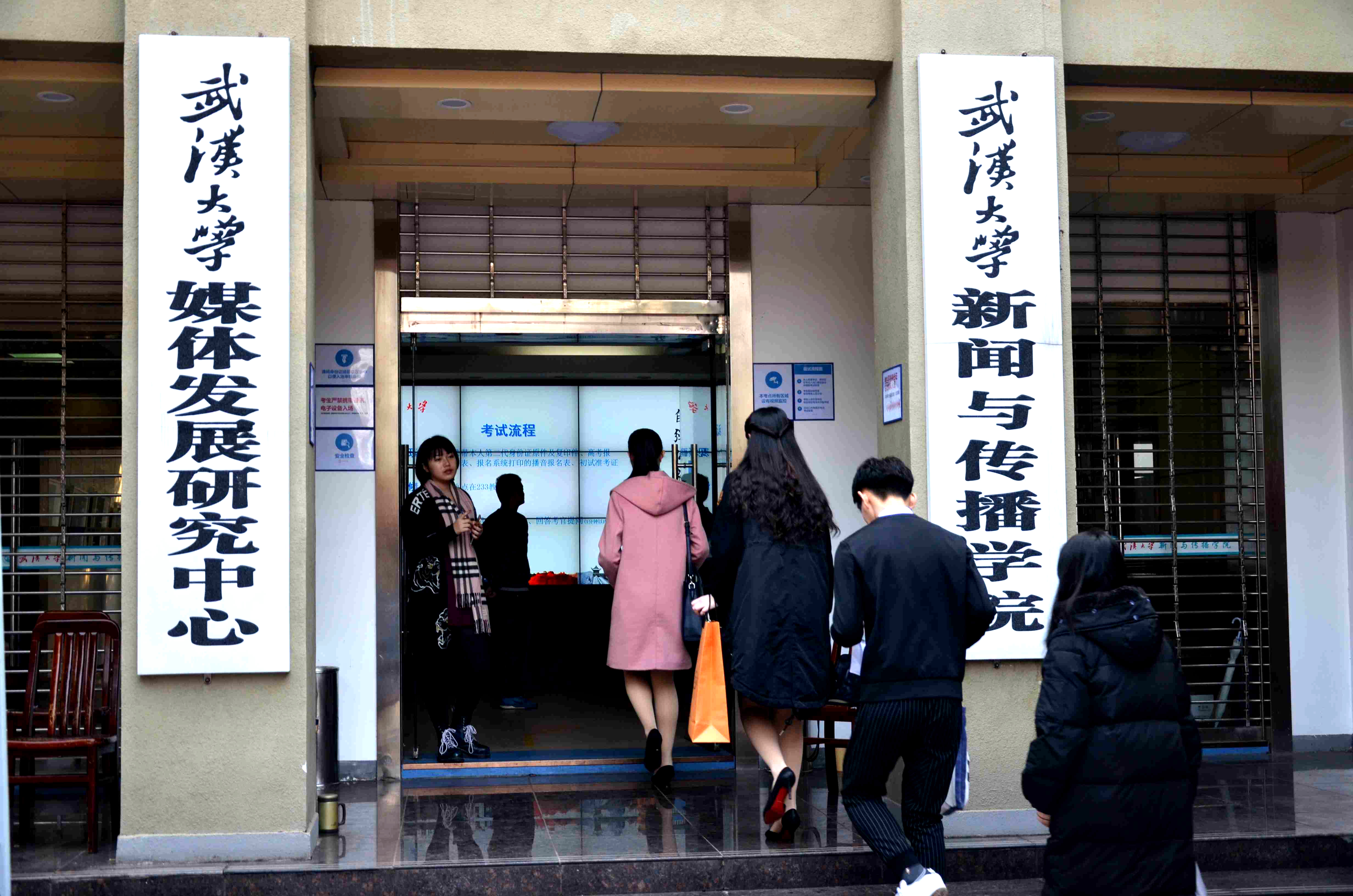 随后,几位同学一齐从院办走出,在“第一版主 ”的牌匾前站成一排,大大方方地对着镜头微笑。去年的这个时候,他们也还是憧憬着武大的艺考生,同样的青涩忐忑,同样的长款羽绒服内搭小西装。时间向前推移,今年,他们作为2015级播音班学生,以“考务”的身份见证了艺考的全程。