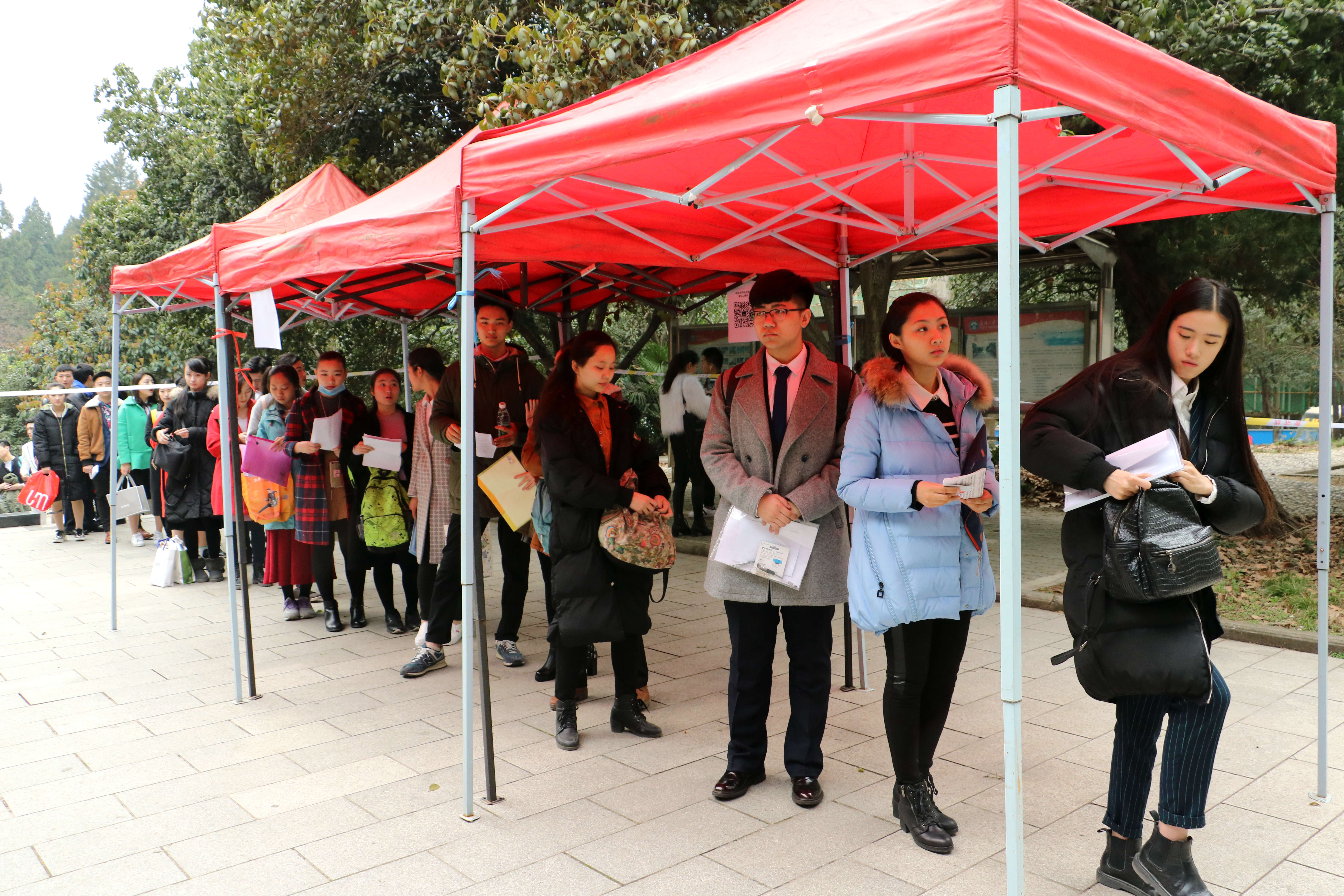 3月2日上午8:40,来自重庆的皮露露(化名)站在了院办门口临时搭建的棚子之下,在她之前,已经有好几轮考生进入了院办候场。此时考务徐文卿(15级播音班学生)正站在门口,引导考生按秩序排队。