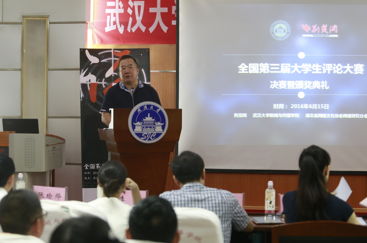 党委书记吴爱军等领导出席了本次比赛。浙江省网信办徐岚、湖北日报评论理论中心主任李琼以及6位“大学生网络评论实训基地”老师担任评委,精彩点评可谓妙语连珠。