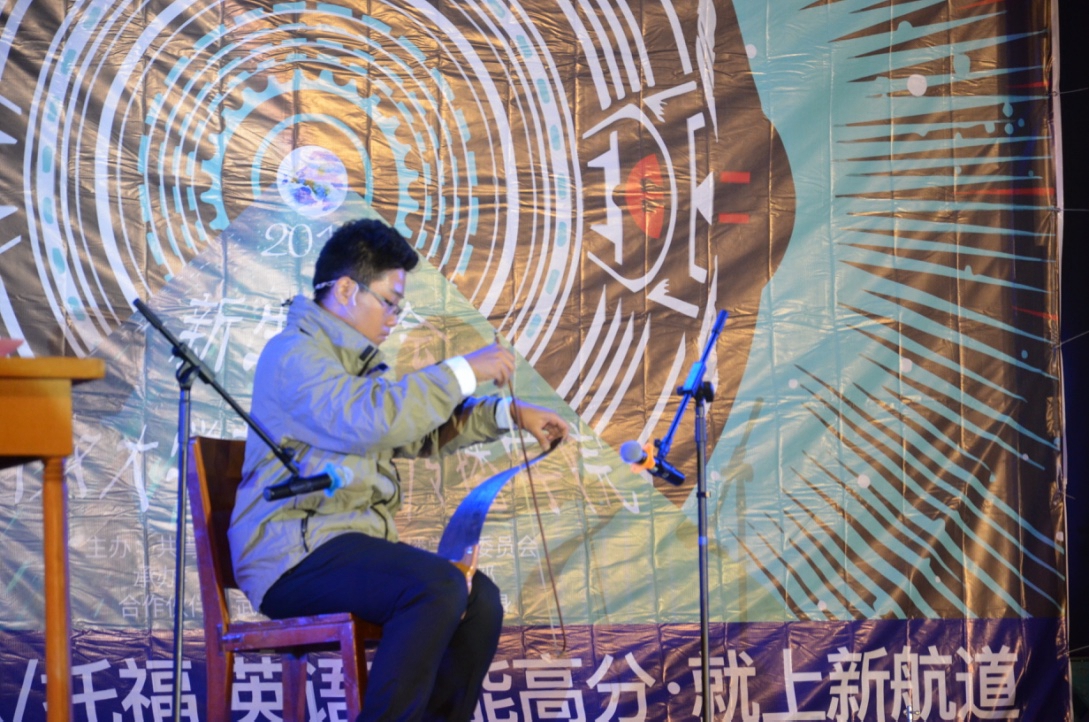 接下来是由播班新生王霆威和张琦带来的武大“选秀”《武大好学生》。在导师“王后熊”和观众的注视下,王霆威一人分饰多位“选手”,拉完深情的小提琴后,又和选秀“主持”张琦演绎了一段令人惊叹的“山东快板”,熟练的台词引来阵阵喝彩,最后,“农民”王霆威展示独门绝技,用锯子拉出一曲《好运来》,不少观众惊呼“请收下我的膝盖”。