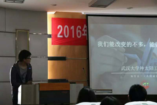 种太阳工作室留守儿童项目部部长杨其文,杨其文同学简单地介绍了种太阳工作室的构成,结合假期实践活动讲述留守儿童的现状,呼吁在座学员们了解社会民生百态,真正做到关心社会、服务社会。然后,杨其文同学与大家分享了他在种太阳的故事和感受,通过几段纪实的视频,让大家真正感受到了志愿服务活动的快乐与感动。“我们能改变的不多,但能做的却不少。”杨其文同学用这句话与大家共勉,希望大家积极行动,积聚小爱,汇聚大爱。