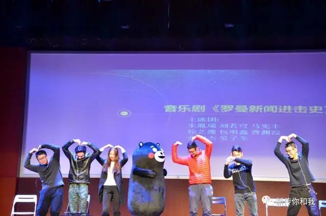 最后的压轴节目,是由新一届主席团集体献上的音乐剧《罗曼新闻进击史》,“QQ”刘若穹摇身变为熊本熊,晏子冬弹唱自创歌曲,主席团演绎新闻院学生生活,真可谓“新”火燎“元”。最后,六位男神主持上台致辞,献上祝福,晚会圆满结束。