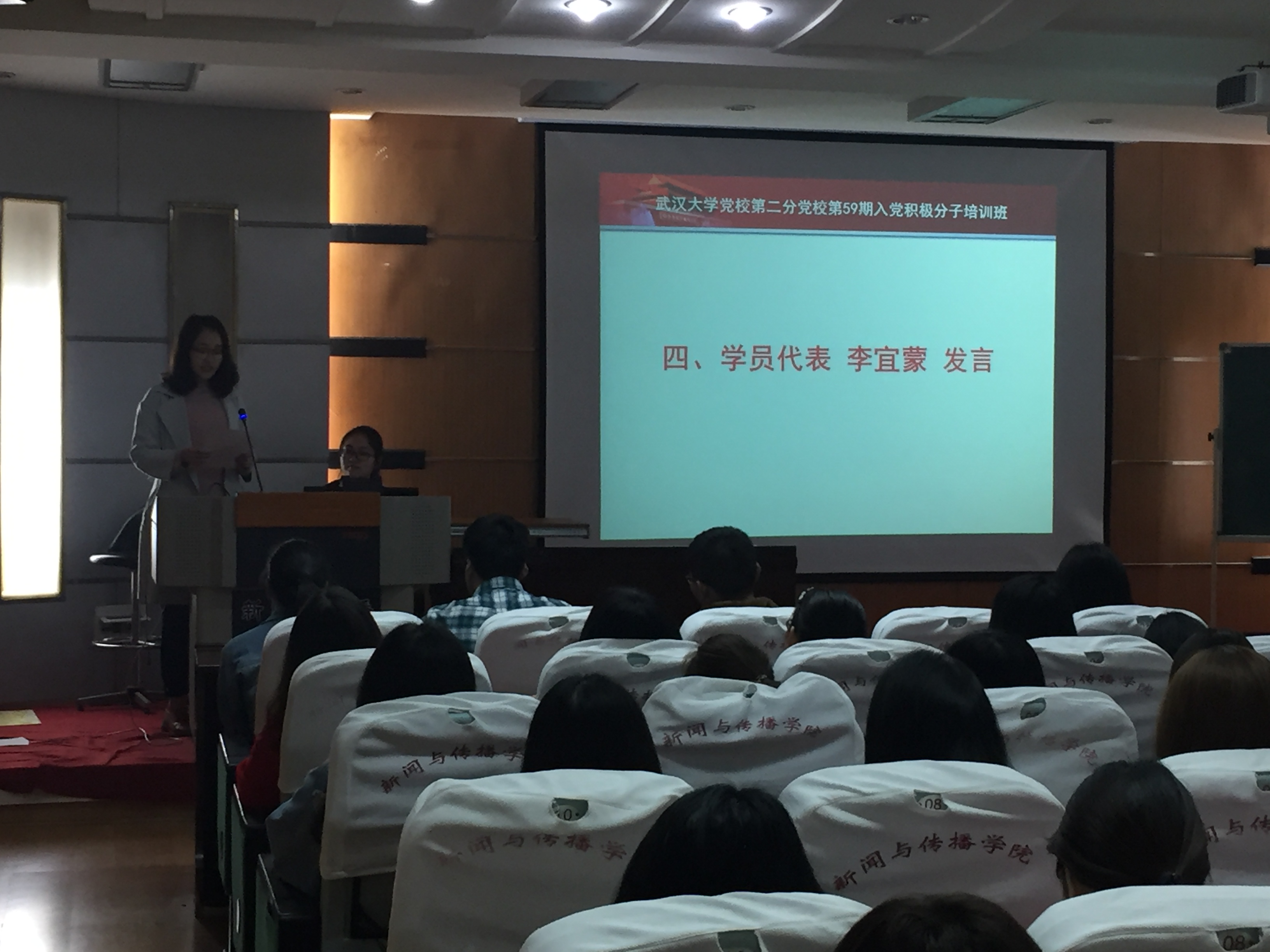 2015级本科生李宜蒙作为学员代表进行了发言,表达了新时代大学生对党的热爱和对国家的忠诚,并表示,全体学员将会严守党校纪律,珍惜学习机会,不断提高自身理论水平,加深对党的认知,加强党性修养,纯洁入党动机,坚定理想信念,在日常生活中以党员标准严格要求自己,发挥先锋作用,争取早日加入党组织。