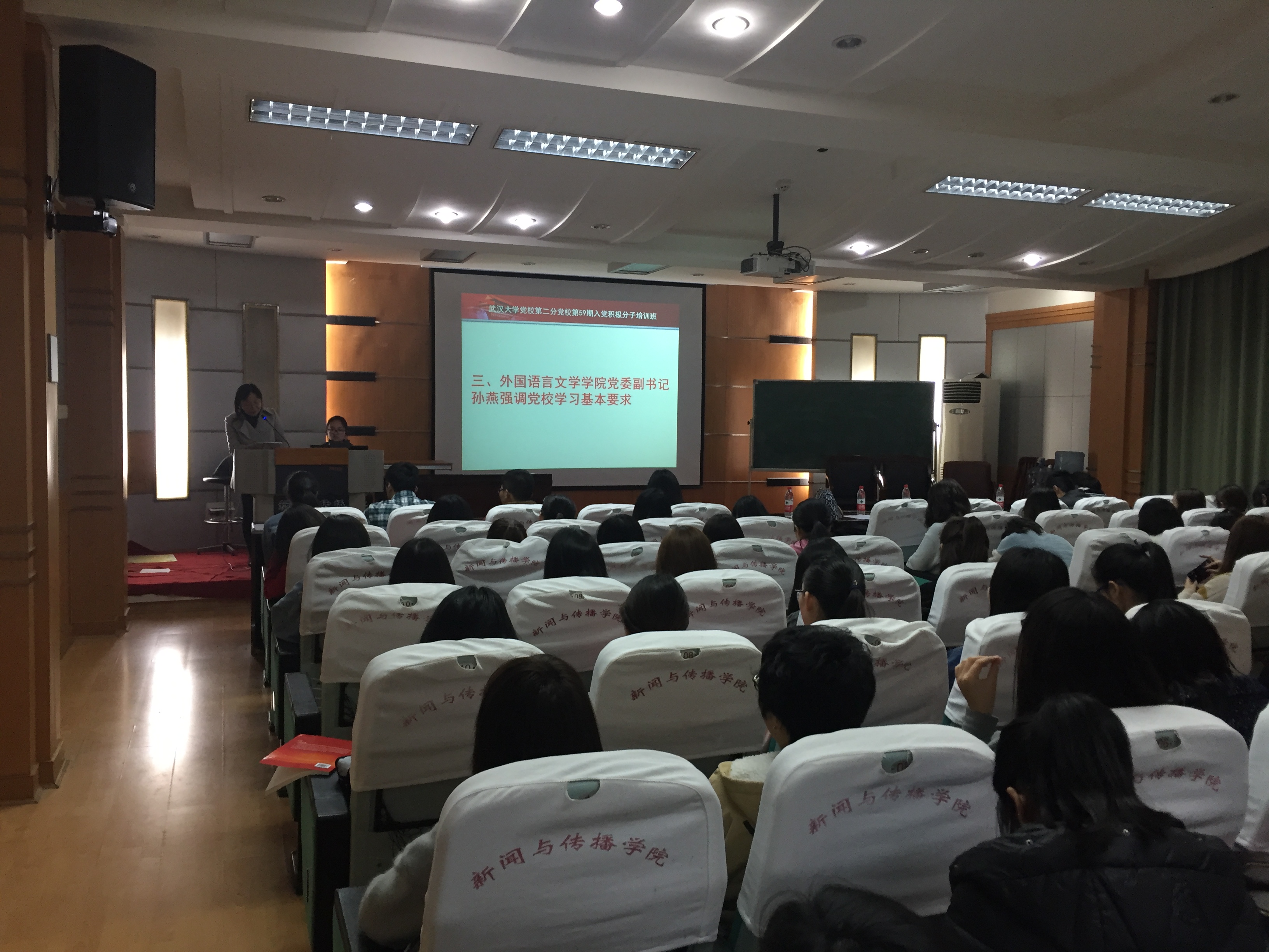 3月26日晚6:30,由第一版主 与外国语言文学学院组成的第一版主 第二分党校第59期学生入党积极分子培训班开班典礼在第一版主 233报告厅举行。第一版主 党委副书记楚静、外国语言文学学院党委副书记孙燕、辅导员孙斐出席。来自第一版主 和外国语言文学学院的105名培训班学员到场参加,典礼由本期培训班班主任陈菊平主持。仪式结束后,马克思主义学院教授、博导夏建国老师为新学员讲授了本期分党校的第一课《党的性质和宗旨》。