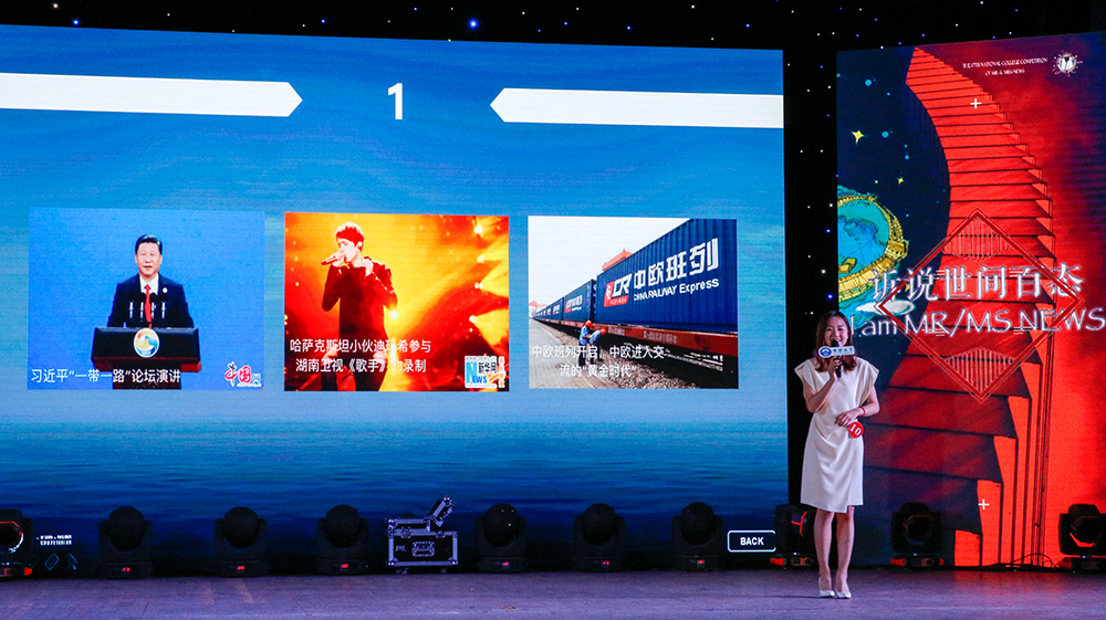 的丁雨萌从中国外交的主题入手,巧妙地串联起“习近平一带一路论坛演讲”、“哈萨克斯坦小伙迪玛希参与湖南卫视《我是歌手》录制”、“中欧进入交往的‘黄金时代’”三个新闻,鲜明的观点、严谨的逻辑让评委老师们眼前一亮。
