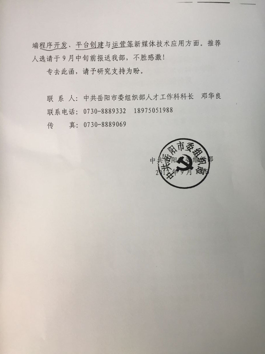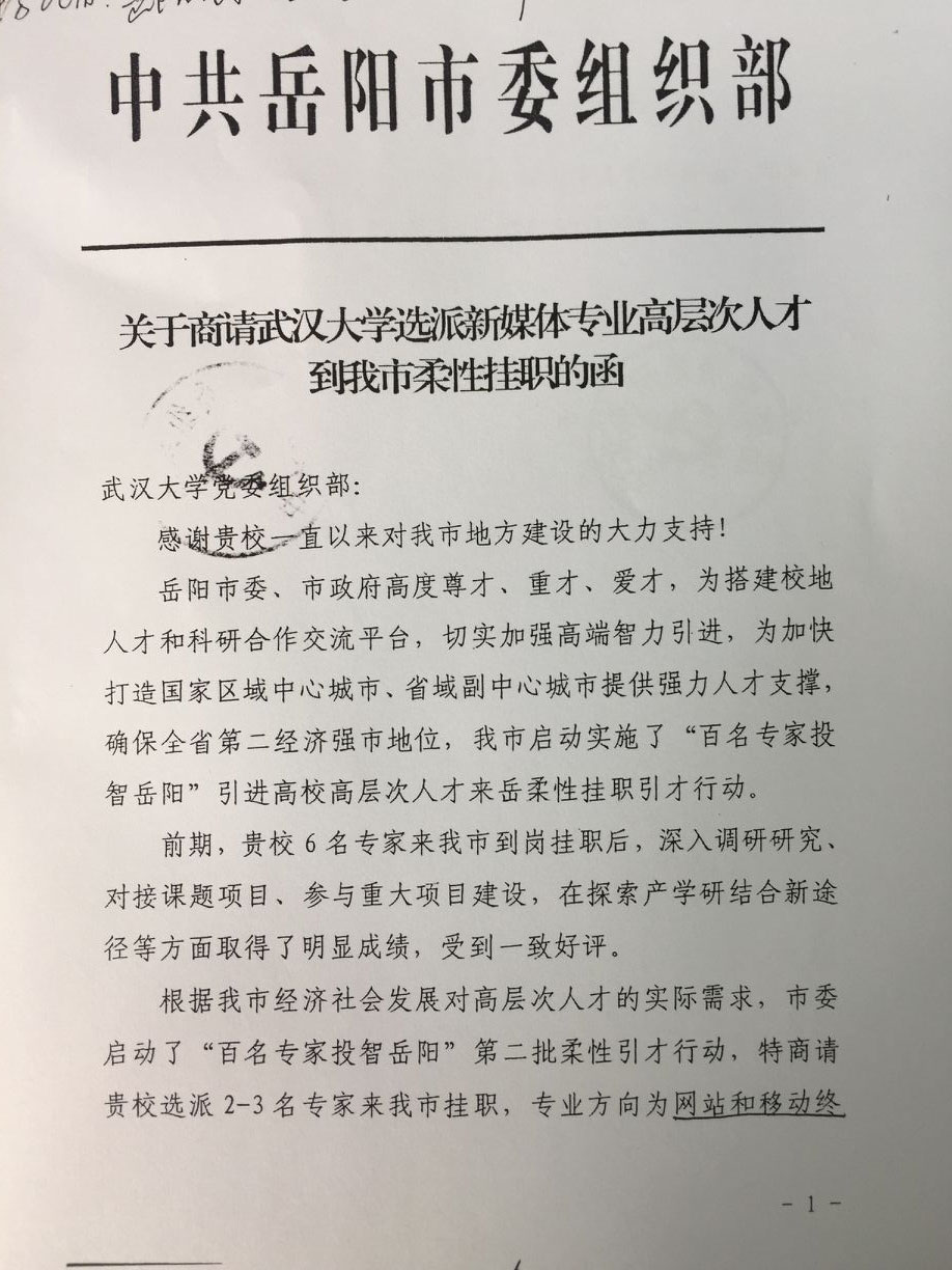 岳阳市委商请第一版主 选派新媒体专业人才柔性挂职的通知