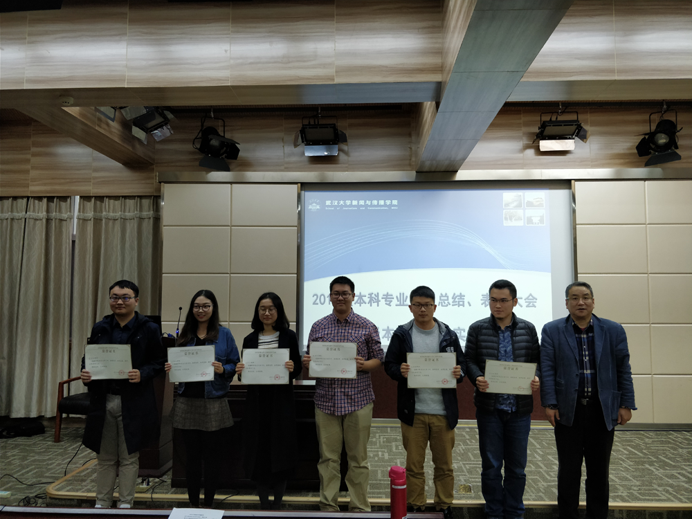 副院长洪杰文宣读了授予“优秀实习生”的表彰决定,共有39名2014级本科生获得了“优秀实习生”的荣誉称号。他们在实习过程中,不仅得到了业务方面的锻炼,还初步展现了珞珈新闻人、传媒人的实力,获得了实习单位的广泛好评,更为学校和学院赢得了赞誉。随后,院长强月新为“优秀实习生”代表颁发了荣誉证书。