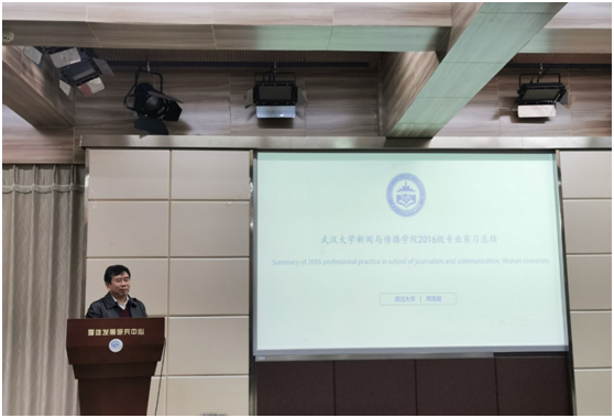 实习领导小组组长周茂君教授从实习区域和实习单位分布等方面,将2016级本科生实习情况与之前做了对比,对2016级本科生实习情况作了总结。他提出2019年的实习在以下几个方面呈现新特点:一是实习地域分布上,北京成为实习主要去向,而长沙增长明显,广州、上海、深圳略有减少,武汉有回流趋势。二是实习单位类型上,互联网单位虽仍然为主要去向,但进入传统媒体实习的人数增长不少。在传统媒体实习人数回流这一现象上,周老师认为学院出台的鼓励政策发挥不小作用。三是专业实习特点上,“触网”势头明显,既有原创内容生产,又有新媒体技术应用、产品运营,还有UI设计、交互设计和网站作品开发等等。最后他也提到,目前第一版主 本科生实习工作中仍存在一些不足,如少数同学将学院实习推荐当作备选、实习期间过于娇气等等。