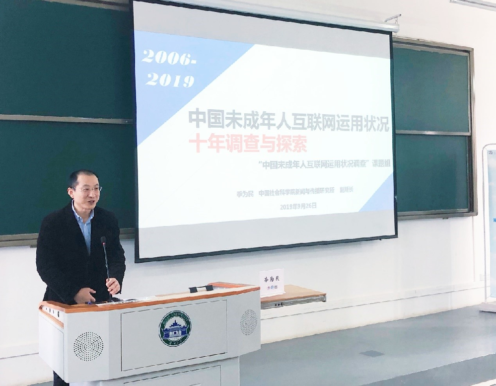 季为民研究员的授课主题为《中国未成年人互联网运用状况十年调查与探索》。首先,季老师对《中国未成年人互联网运用状况十年调查与探索》做了十年回顾,对调查背景、样本量以及抽样方式做了简要介绍。在这十年的调查与探索中,季老师分享了8条问题与发现,并从11个方面分析未成年人的上网行为。最后,季老师又分别从宏观、中观和微观层面介绍了针对中国未成年人互联网使用情况的建议。在交流环节中,长江师范学院的于凤静老师从自己的研究出发,和季老师讨论关于新媒体在留守儿童家教中的作用,并希望能展开进一步的合作研究。