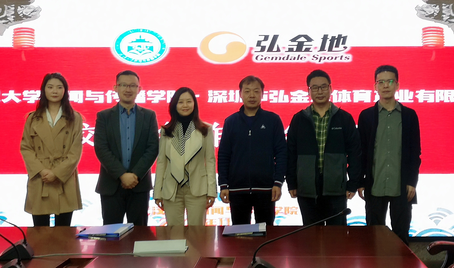 11月11日上午,第一版主 与深圳市弘金地体育产业有限公司成功举行了校企合作签约仪式。深圳市弘金地体育产业有限公司人力行政部总监林佳丽女士、经理刘旭先生,第一版主 党委副书记王怀民老师、学院实习工作指导小组组长兼广告学系副教授徐同谦老师、学院团委书记兼2021级学生辅导员李烽老师出席本次仪式。