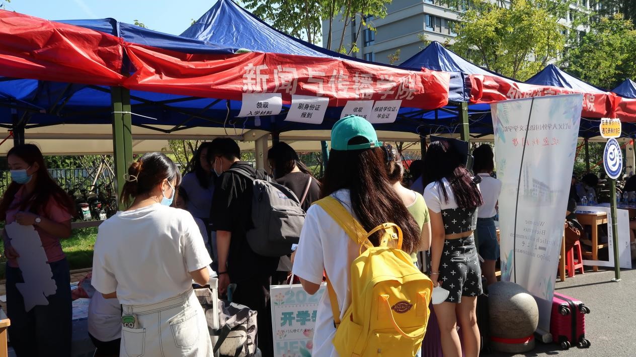 查验“双证”和录取通知书,身份核验,发放校园卡和开学大礼包……迎新工作人员分工明确,各司其职,有条不紊地工作着。对于新生们的困惑和疑问,他们也有问必答,热情洋溢地为大家解决问题。