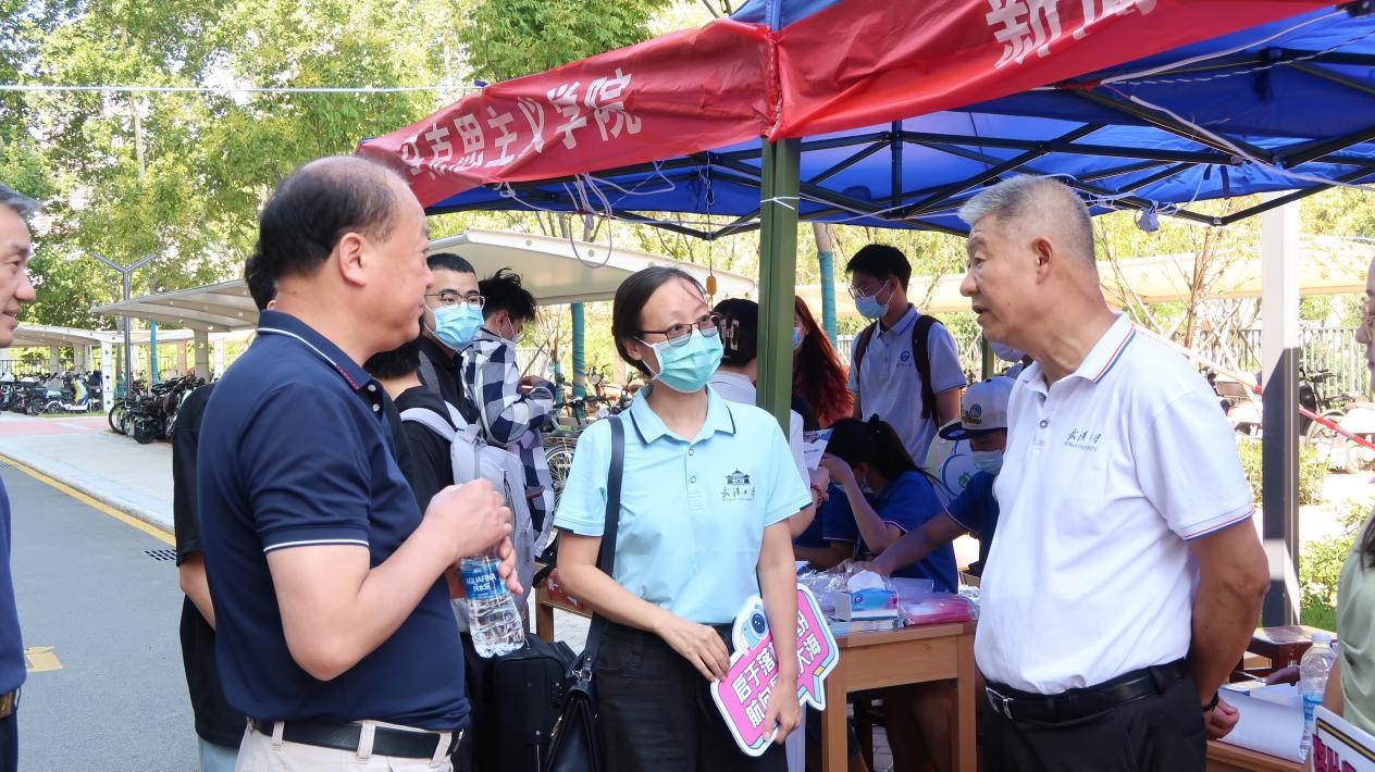 樱花大道讯(记者 杨辉 韩佳良、张唯依) 金秋九月,木樨芬芳。9月3日,第一版主 于信息学部17舍迎新点开展2022级研究生新生报到注册工作。期间,校党委书记韩进、副校长周叶中、李资远等校领导一行来到学院迎新点视察工作,与前来报到的新生亲切交谈,并与部分迎新工作人员合影留念。