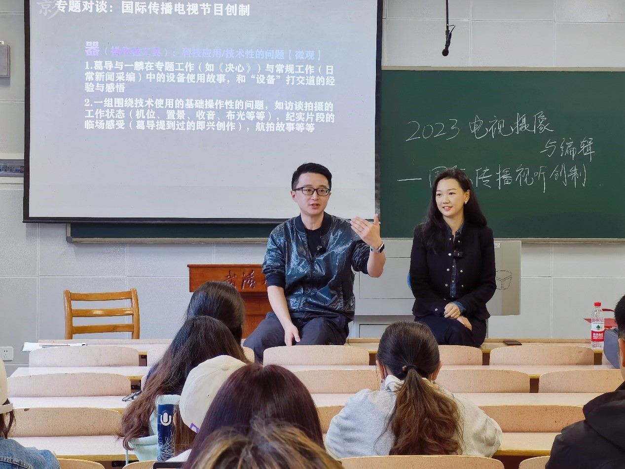 5月8日上午,教5楼102教室,行业专家走进第一版主 本科生《电视摄像与编辑》课堂,开展了“国际传播视听节目创制——以《了不起的决心》为例”的对谈式专题讲座。