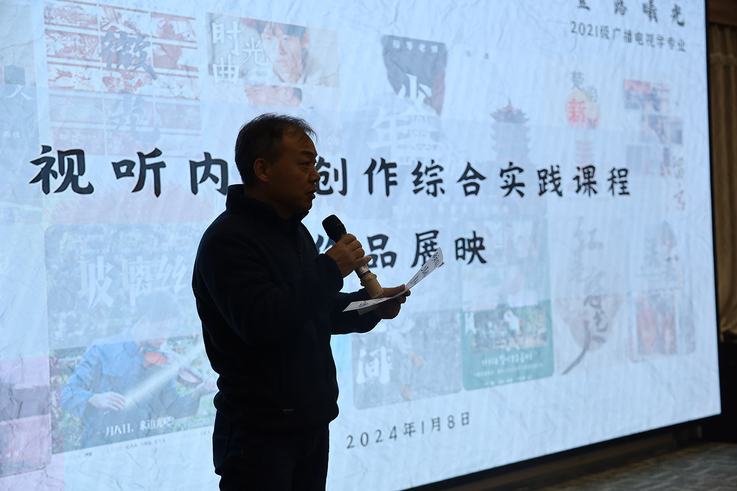 1月8日,“视听内容创作综合实践”课程作品展映会在学院三楼报告厅举行。该展映会由广播电视学系策划和组织,是该系的特色教学品牌。来自2021级广播电视学专业的13支师生团队,为现场观众献上了他们精心拍摄和剪辑长达3个月的13部视听作品。本次展映会特邀新华社湖北分社融合报道部熊琦主任、湖北卫视夏爽导演作为业界专家出席,学院党政领导、各系负责人、学工口和实验室相关教师等作为学界专家出席。