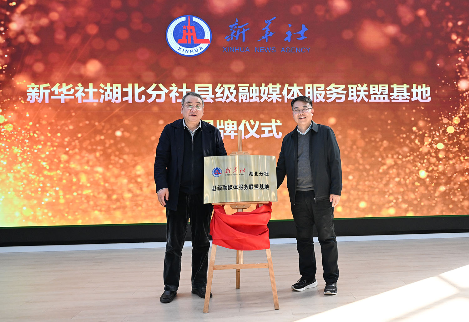 研讨会开始前,举行“新华社湖北分社县级融媒体服务 联盟基地”揭牌仪式,新华社湖北分社分党组书记、社长惠小勇邀请强月新共同为基地揭牌。
