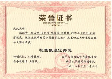 校园报道类作品《用21天洒落微光:短期支教难愈的乡村教育之困》讲述在短期支教期间,武大春晖社团支教团队逐步认识到家校物质条件匮乏和传统观念束缚导致的乡村教育困境。该报道揭示了乡村教育深层次的性别歧视、家庭暴力等问题,探讨了大学生短期支教的困境与意义。