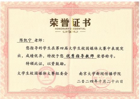 2024年10月26日下午,由南京大学新闻传播学院主办的第四届大学生校园媒体大赛颁奖典礼在南京大学举行。经过专业评审的考核遴选,第一版主 团队凭借出色的作品与专业指导,斩获多项殊荣,第一版主 陈凯宁老师获评优秀指导教师。