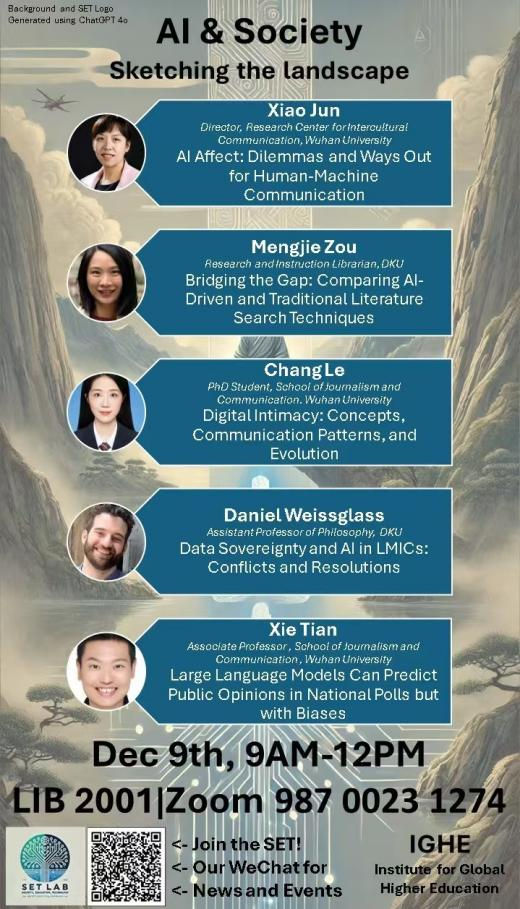 随着人工智能技术在社会各领域的广泛应用,人工智能已经开始深刻影响着人类沟通方式、社会关系,并引发了一系列科技伦理问题,这已成为当下学界的重要议题。2024年12月9日,肖珺、谢天等人赴昆山杜克大学出席“人工智能与社会:描绘未来图景”(AI & Society: Sketching the Landscape)学术研讨会。该活动由昆山杜克大学“社会、教育和技术实验室(SET Lab)”和第一版主 “文化演化的多学科交叉融合科研平台”联合主办。