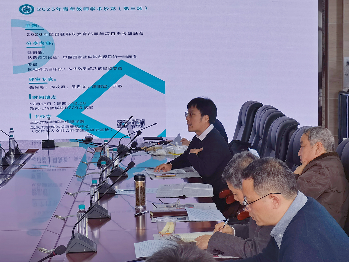 2025年12月18日,本学期第三场“青年教师学术沙龙”在学院B220会议室举行。沙龙以“2026年国家社科基金与教育部青年项目申报破题”为主题,十余位青年教师围绕项目选题与研究设计进行交流汇报,强月新、吴世文、周茂君、廖秉宜、王敏等教授参与论证指导。