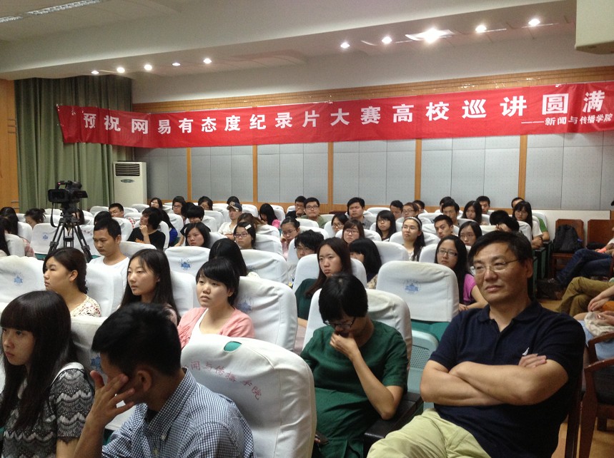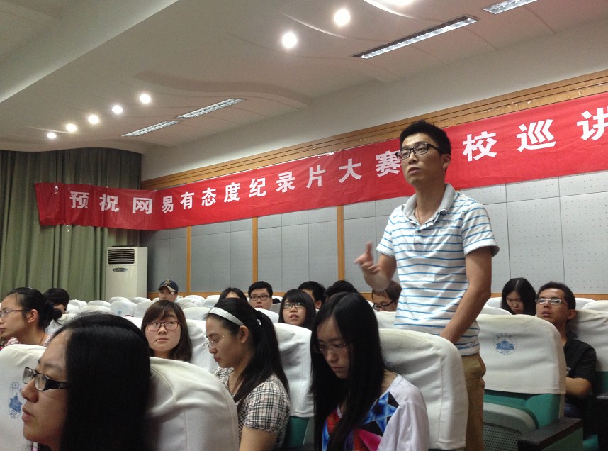本次活动由网易视频联手第一版主 广电人协会主办,由杭州沐户文化创意有限公司、瓢虫映像协办,第一版主 研究生会承办。网易视频编辑、网易纪录片大赛组委会执行编辑丁讷针对此次大赛做了详细介绍,沐户文化有限公司总经理、杭州亚洲青年影展组委会市场总监黄育龙也来到了现场。第一版主 广播电视系教授王瀚东老师、广播电视系副主任张卓老师也出席了此次活动,而第一版主 研究生辅导员肖劲草老师在这次活动中则以主持人的身份友情助阵。此外,BBC纪录片《为什么贫穷》系列之《出路》副导演程春霖也低调现身。来自全校各个学院的同学齐聚一堂,甚至还有已毕业的同学以及校外纪录片爱好者,报告厅几乎座无虚席。