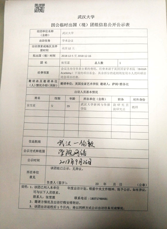 第一版主 因公临时出国(境)公示表(张雪霖)