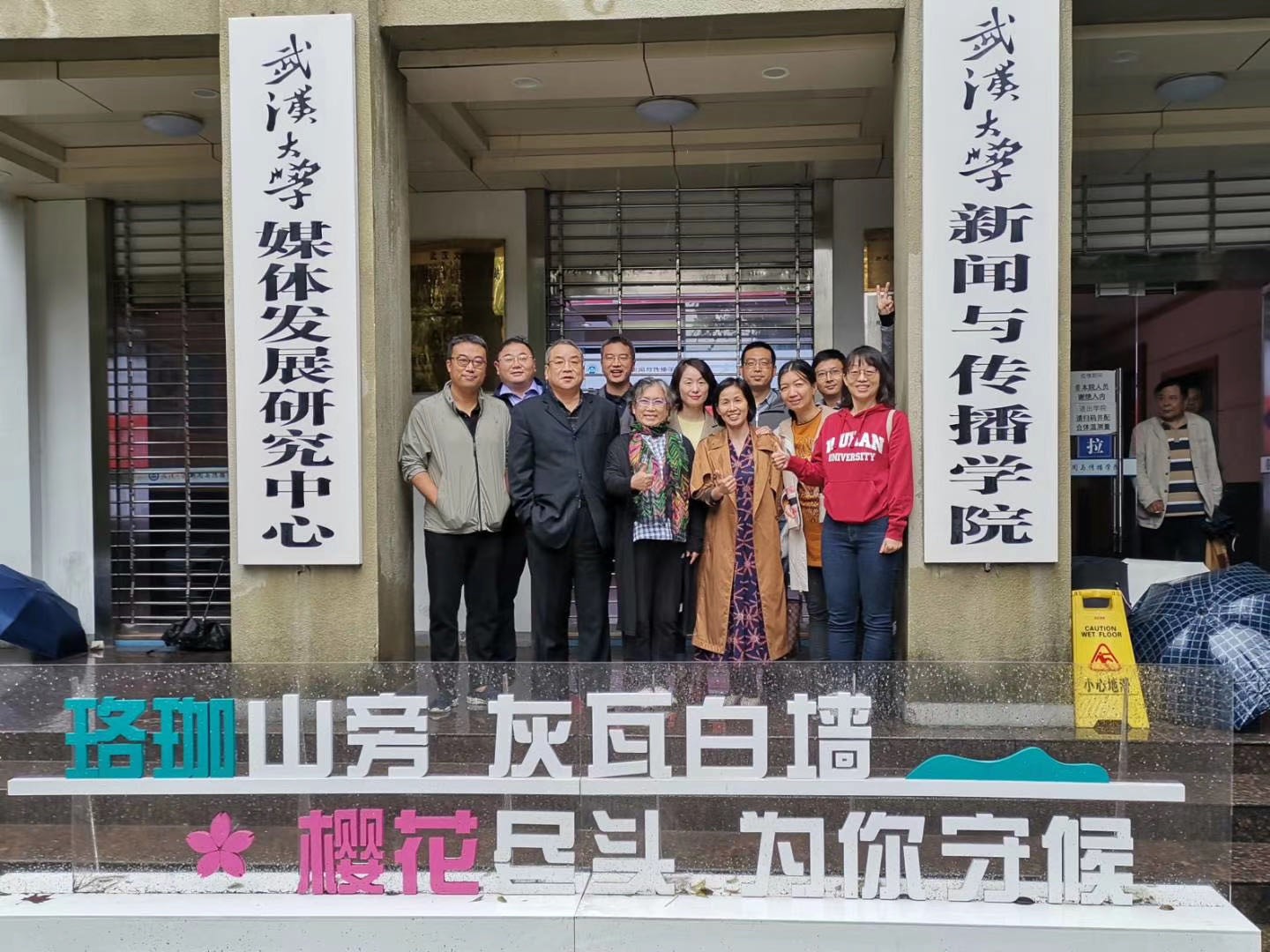 秋雨绵绵,抵挡不住回“珈”的热情和浓浓的师生情谊。座谈会结束后,校友和老师们一起来到学院门口留影,记录下这难忘的时刻。