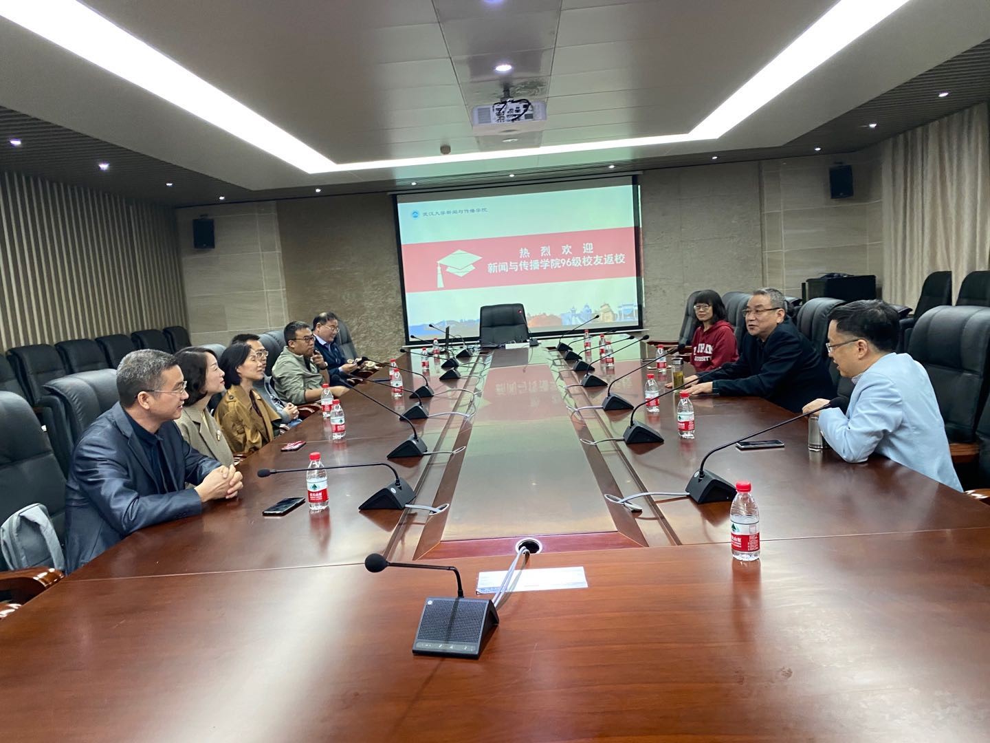 首先,同学们各自介绍了自己毕业后的工作经历和现状,表达了对学校以及学院的思念和感激之情。强月新院长向同学们介绍了二十多年来第一版主 的发展和变化;单波老师、夏琼老师、谢雅维老师、蔡小容老师也分别回顾了跟同学们共处的时光。老师们感谢同学们记得学院和老师们,第一版主 的学生们永远是学院的骄傲;希望同学们在人生道路上无畏前行,无论何时欢迎大家回“珈”,“珞珈山旁,灰瓦白墙;樱花尽头,为你守候”。随后,师生们一起观看了96级新闻系同学们在校期间的老照片,旧日时光,历历在目,引发了师生们无限回忆。