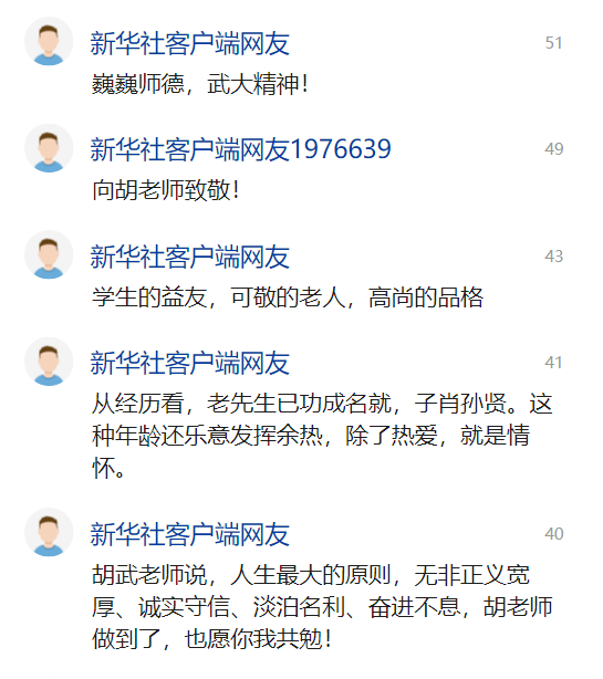 胡武老师对于新闻事业的热爱与情怀同样感动着素未谋面的社会大众,“虽不是武大人,但被胡老的精神感动!感谢胡武老师这样兢兢业业,默默奉献的领路人,愿您身体健康!!”“大学者,大师也。”很多人在报道评论区送上了对胡武老师的安慰与祝福。